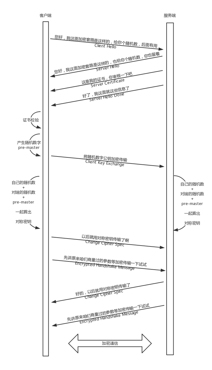 非对称加密在性能上不如对称加密,但是安全性上要更好,因此 HTTPS 综合运用了这两种加密方式的优势,使用非对称加密传输对称加密需要用到的密钥,而真正的双方大数据量的通信都是通过对称加密进行的,结合数字证书(包含公钥信息)验证服务端公钥的真实性,HTTPS 的底层原理如下: