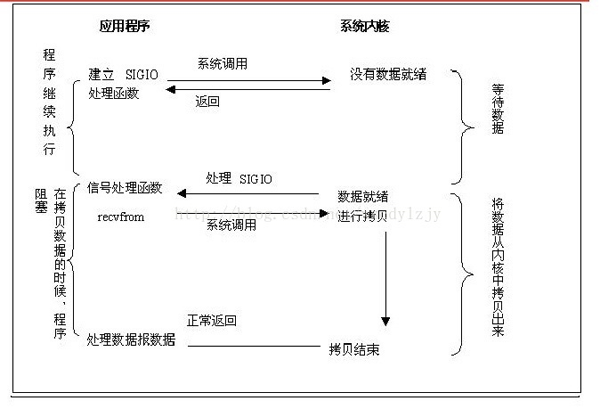说明:首先,我们允许套接口进行信号驱动I/O,并安装一个信号处理函数SIGIO,如果数据没有准备好,则立即返回结果,进程继续工作并不阻塞。当数据准备好时,系统内核会主动发送一个SIGIO信号给应用程序,应用程序收到信号后,可以在信号处理函数中调用I/O操作函数recvfrom进行数据处理。信号驱动I/O模型的优点是当数据报到达时,可以不阻塞,主循环可以继续执行,只是等待处理程序的通知,或者数据已经准备好被处理,或者数据报已经准备好被读了。
