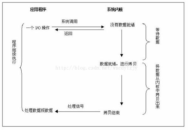 说明:当一个异步过程调用发出后,调用者不能立刻得到结果。实际处理这个调用的部件在完成后,通过状态通知和回调通知来告诉调用者的输入输出操作。用户可以直接对I/O执行读写操作,这些操作告诉内核用户读写缓冲区的位置,以及I/O操作完成之后内核通知应用程序的方式,就是上面讲的通过状态通知或者回调通知来告诉调用者。异步I/O的读写操作总是立即返回,但没有返回结果说是否阻塞,因为异步I/O操作真正的读写操作已由内核接管,内核自己对数据处理完成后生成一个信号,然后通知用户刚才交给自己的事件已经处理完成。