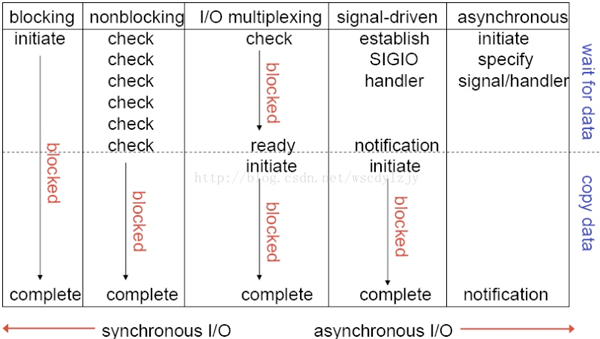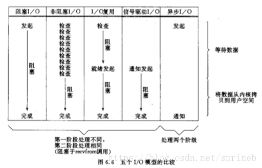 从两张图中我们可以看到,越往后,阻塞越少,理论上效率也是最优。其中五种I/O模型中,前三种属于同步I/O,后两者属于异步I/O。