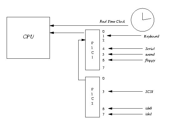 以键盘为例,当用户按下键盘某个按键时,键盘会给cpu的中断引脚发出一个高电平。cpu能够捕获这个信号,然后执行键盘中断程序。下图展示了各种硬件通过中断与cpu交互。