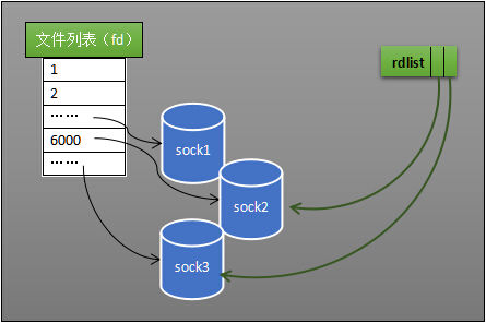 select低效的另一个原因在于程序不知道哪些socket收到数据,只能一个个遍历。如果内核维护一个“就绪列表”,引用收到数据的socket,就能避免遍历。如下图所示,计算机共有三个socket,收到数据的sock2和sock3被rdlist(就绪列表)所引用。当进程被唤醒后,只要获取rdlist的内容,就能够知道哪些socket收到数据。