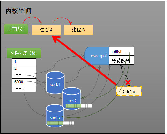 当socket接收到数据,中断程序一方面修改rdlist,另一方面唤醒eventpoll等待队列中的进程,进程A再次进入运行状态(如下图)。也因为rdlist的存在,进程A可以知道哪些socket发生了变化。