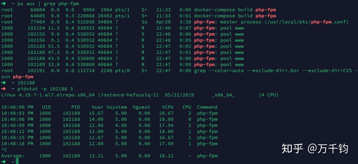 我们通过pidstat, 查看php-fpm单一进程的详细状态。首先选出一个php-fpm进程, 然后使用pidstat查看进程详细的运行情况