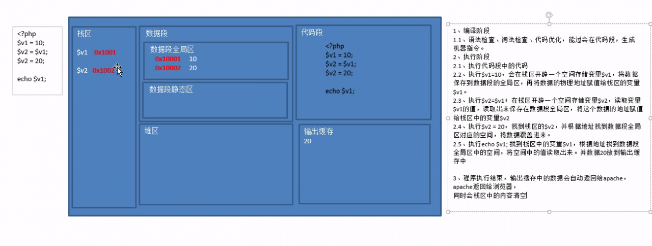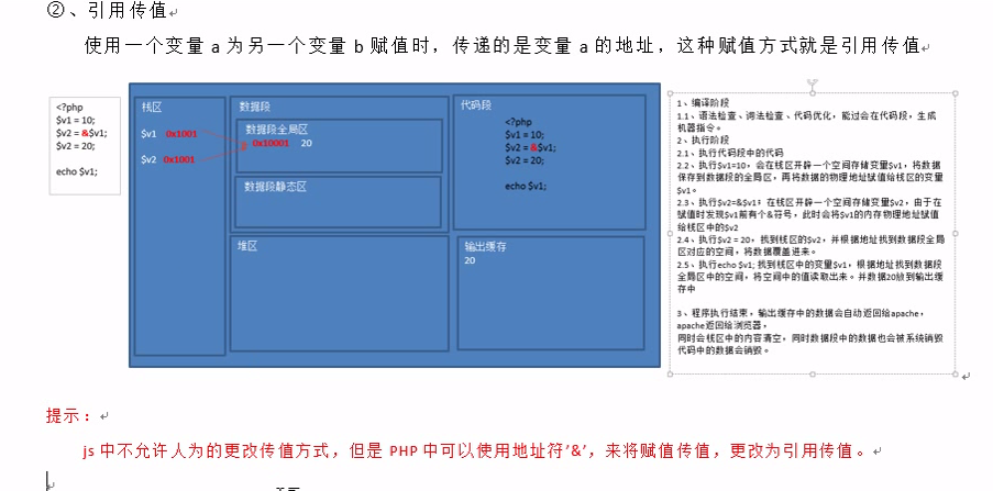 堆区主要存放不能固定大小的变量值,如对象、数组!(PHP复制数组为值传递,而对象则是引用传值)