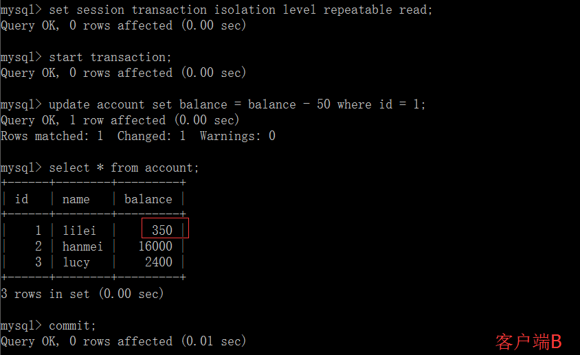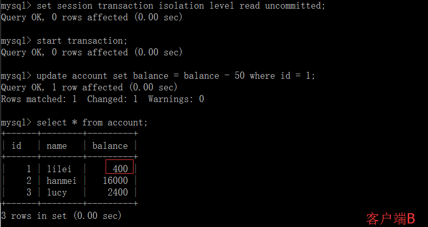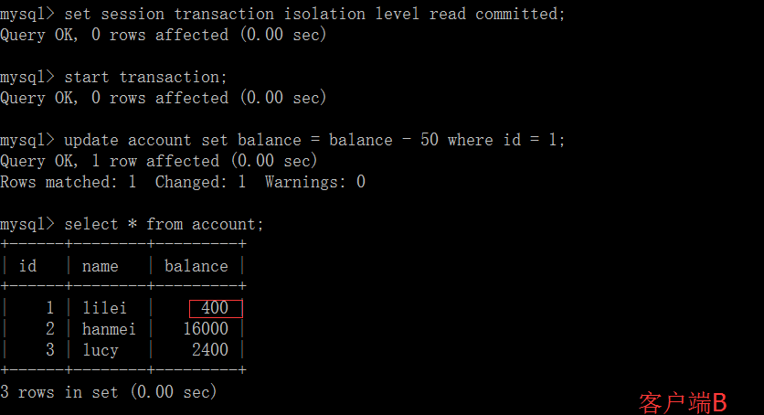 (5)在客户端A执行更新语句update account set balance = balance - 50 where id =1,lilei的balance没有变成350,居然是400,是不是很奇怪,数据不一致啊,如果你这么想就太天真 了,在应用程序中,我们会用400-50=350,并不知道其他会话回滚了,要想解决这个问题可以采用读已提交的隔离级别