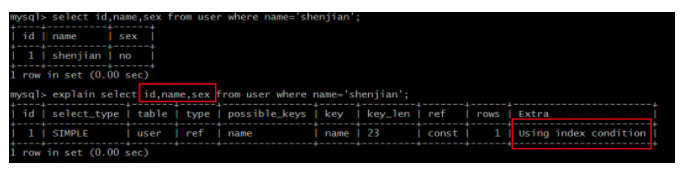 能够命中name索引,索引叶子节点存储了主键id,但sex字段必须回表查询才能获取到,不符合索引覆盖,需要再次通过id值扫码聚集索引获取sex字段,效率会降低。