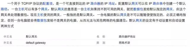 可以看出缺省网关就是默认网关,那么有人会说既然有一样为什么又凭空多出来一个缺省网关,我的理解是这样的,应该说默认网关是缺省网关的一个子集。缺省网关有一个定义的默认路由设置(指向默认网关),缺省网关就相当于一个代理服务器暂时管理发送的数据包,当发送到目标主机时先由目标主机的缺省网关接收再找到对应的默认网关,就相当于缺省网关是父类,默认网关是子类~~