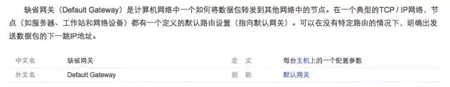 缺省网关(Default Gateway)是计算机网络中一个如何将数据包转发到其他网络中的节点。在一个典型的TCP / IP网络,节点(如服务器、工作站和网络设备)都有一个定义的默认路由设置(指向默认网关)。可以在没有特定路由的情况下,明确出发送数据包的下一跳IP地址。