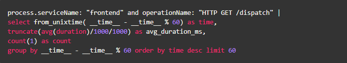 1. 以分钟为单位统计 frontend 服务的 HTTP GET /dispatch 操作的平均延迟以及请求个数。