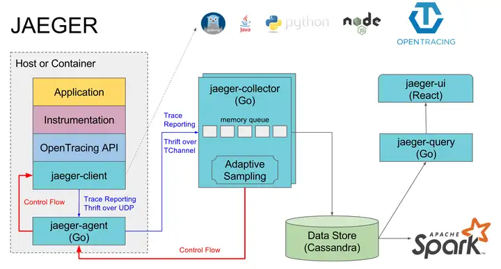 • Jaeger Client - 为不同语言实现了符合 OpenTracing 标准的 SDK。应用程序通过 API 写入数据,client library 把 trace 信息按照应用程序指定的采样策略传递给 jaeger-agent。